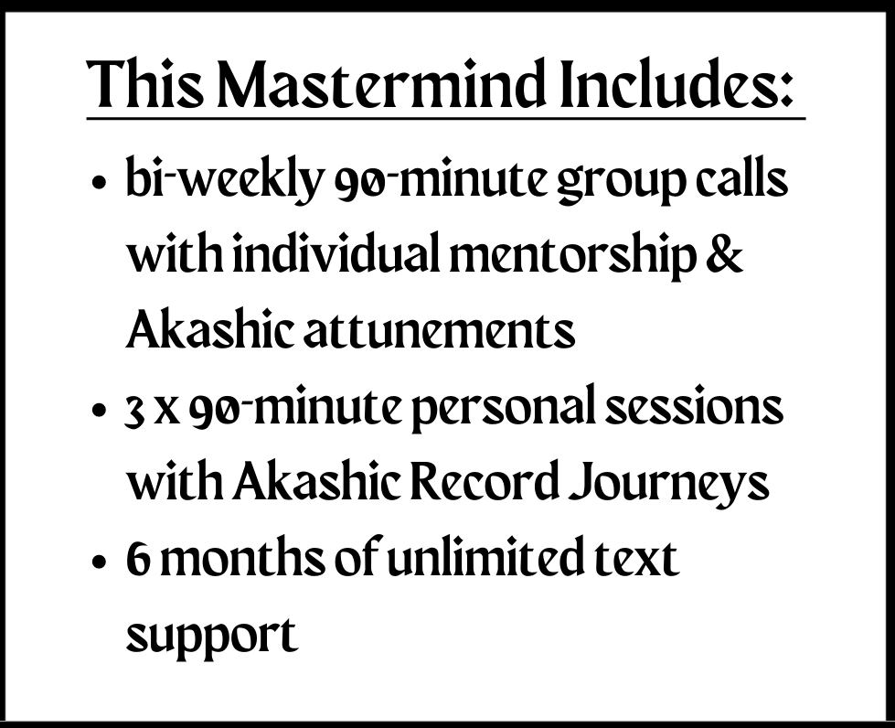 ** If you sign up with Early Bird pricing, you'll also receive an additional Akashic Reading that you can use anytime during the Mastermind, or up to 2 months after the mastermind closes.